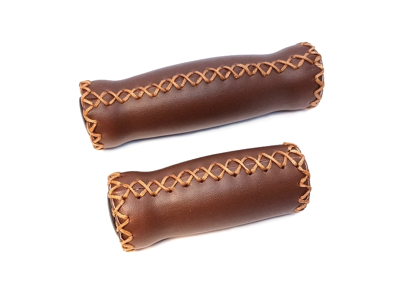 Pehmed ja mugavad retrostiilis käepidemed Velo ProX VLG-617-3A, pruunist Eco-nahast. Vasaku käepideme pikkus on 127 mm ja parem 92 mm. Külgedel ja otstes on käsitsi tehtud õmblused. Erineva pikkusega käepidemed on disainitud parempoolse Gripshift käiguvahetajaga jalgratastele.