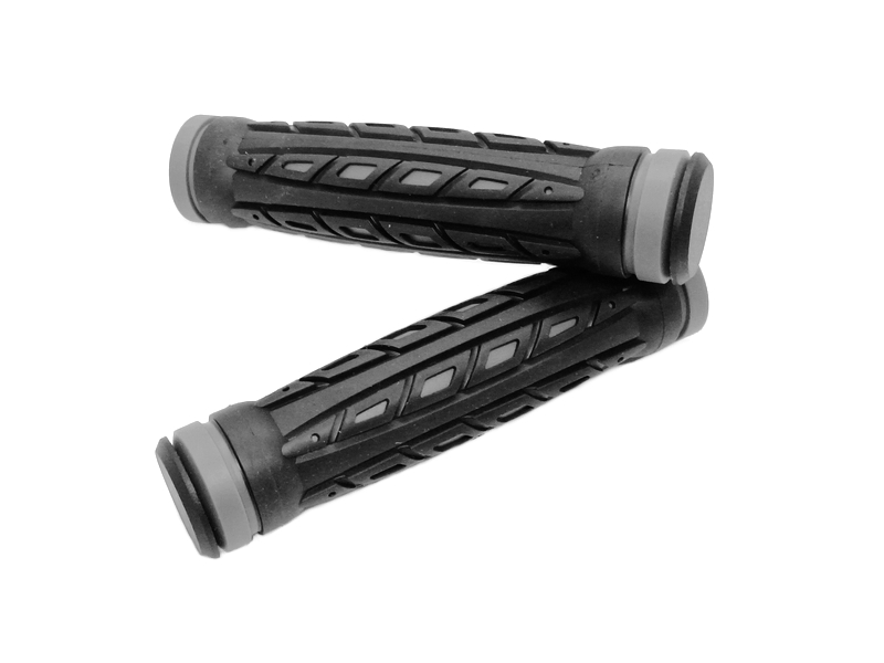 Hea haarduvuse ja libisemiskindla mustriga jalgratta käepidemed, mustad hallide otstega. Pikkus 128 mm.