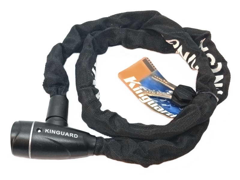 Jalgratta kettlukk Kinguard, võtmega avatav. Keti pikkus on 1200 mm ja keti terase läbimõõt 5 mm. Tugevate teraslülidega kett on kaetud musta tekstiiliga. Lukukorpus on valmistatud mustast plastikust.